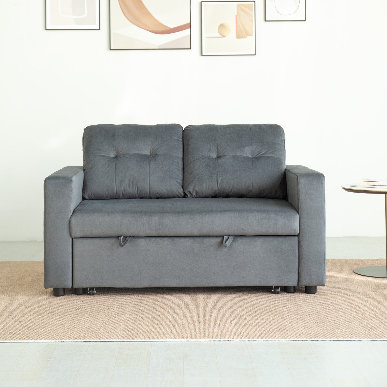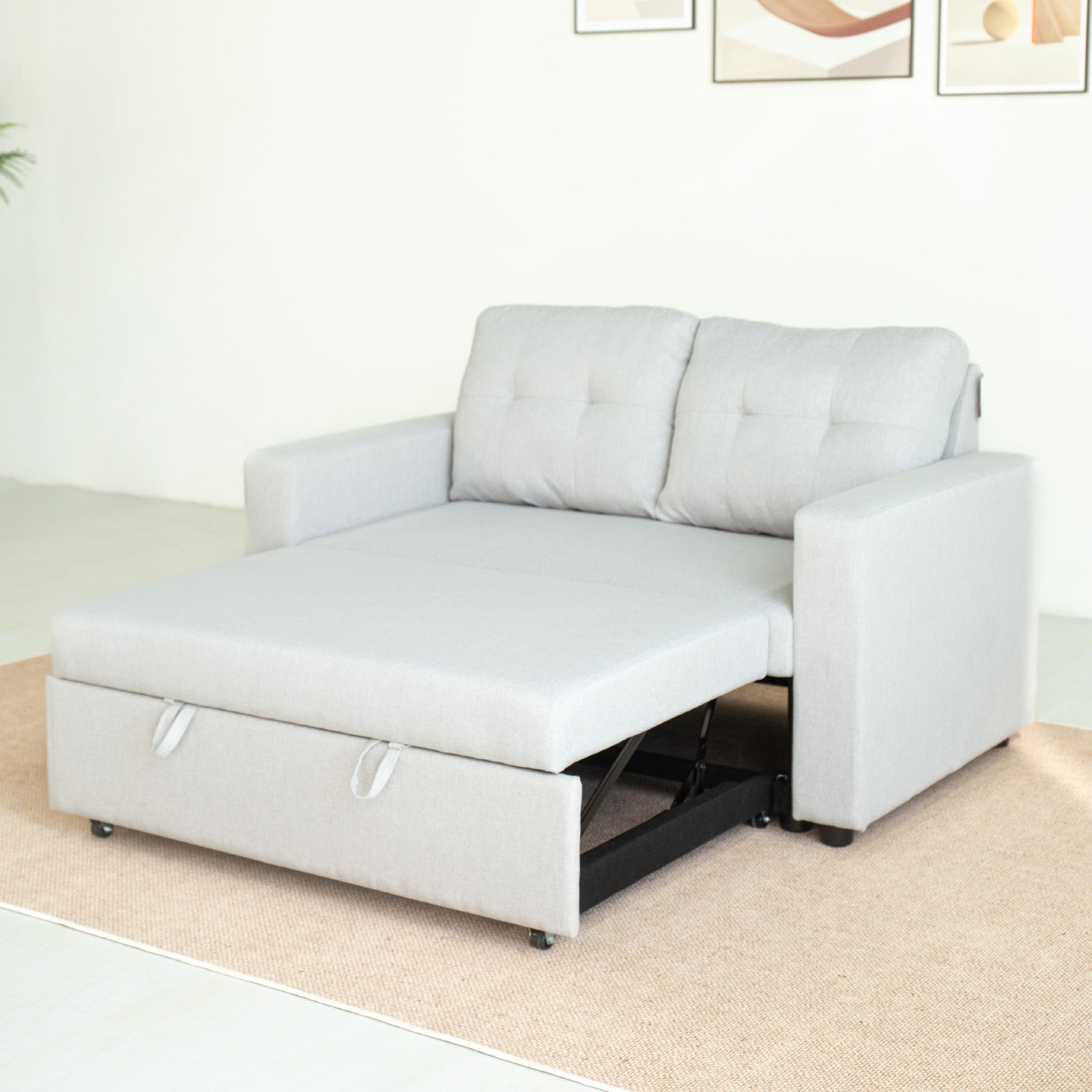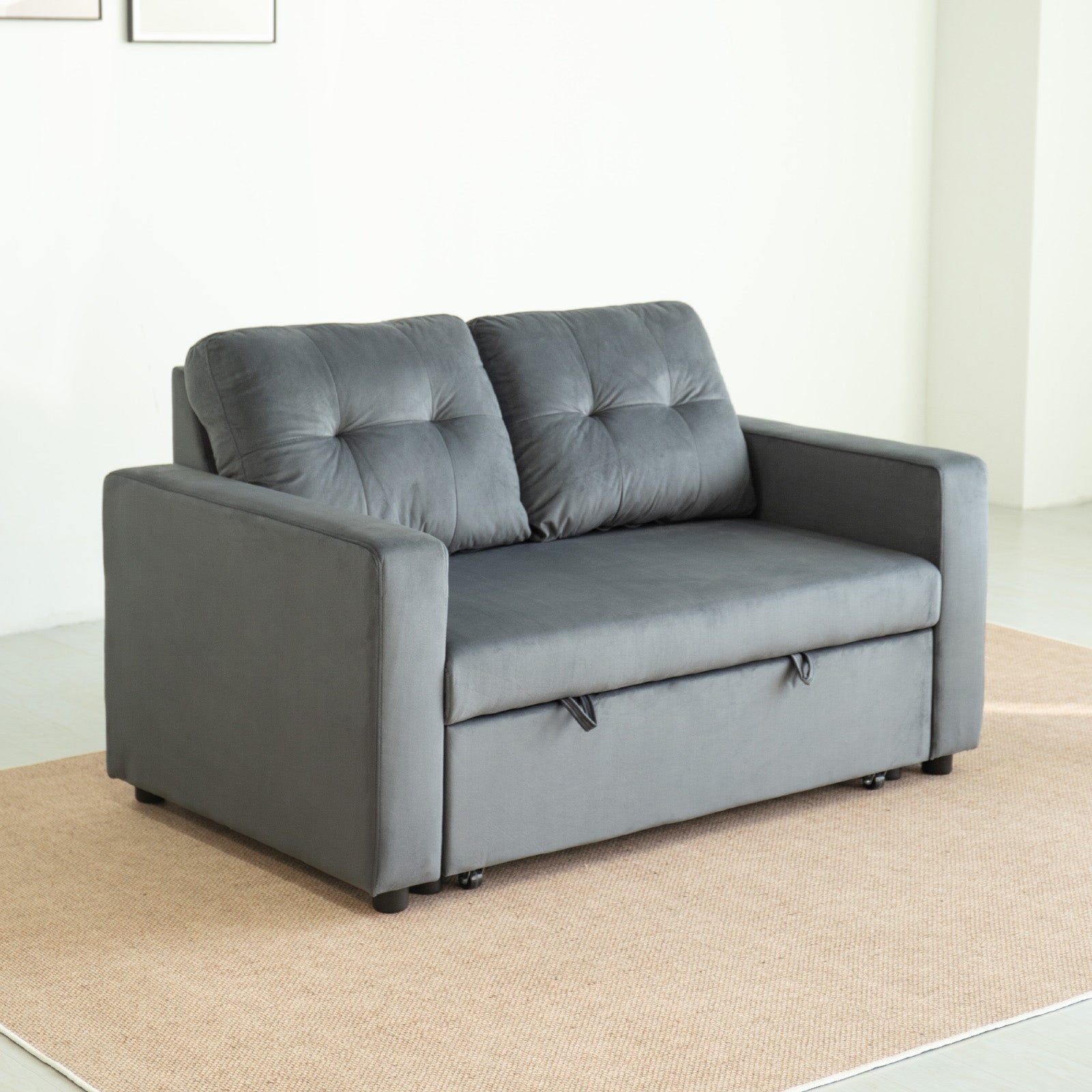 The wide, plush seats and tufted backrest deliver a modern yet timeless aesthetic, while the sturdy wooden frame ensures it’s built to last. When it’s time to unwind or host guests, the sofa transforms seamlessly into a cosy bed - no fuss, just comfort.