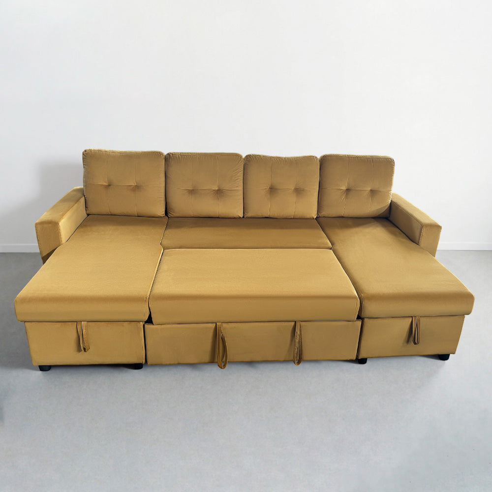 Add a touch of elegance and practicality to your living space with this velvet fabric corner sofa bed. Upholstered in luxuriously soft-touch velvet, it combines comfort and style with a beautifully tufted backrest and a spacious chaise for lounging in total relaxation.