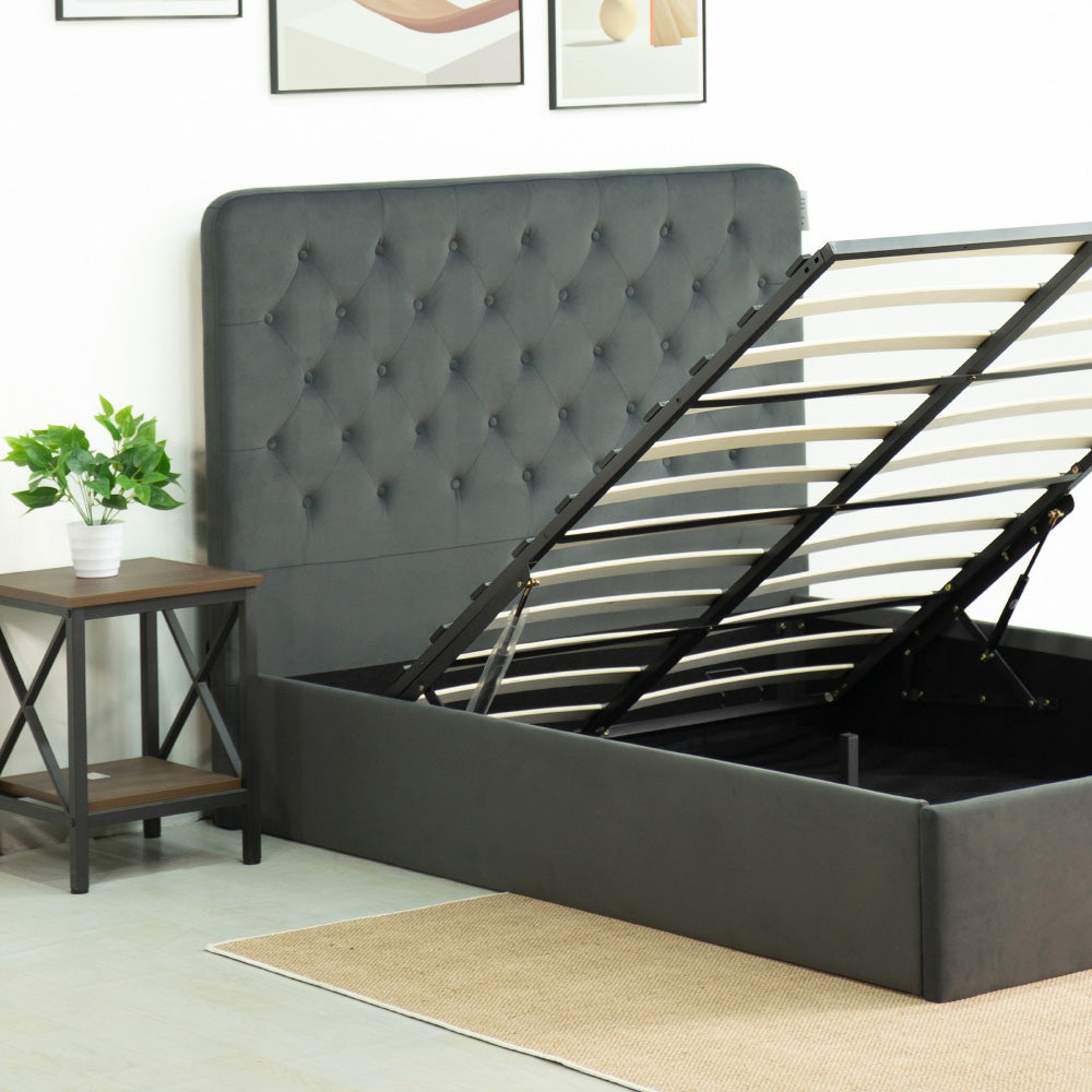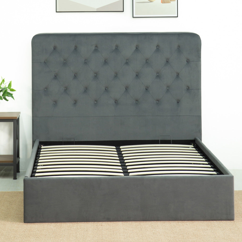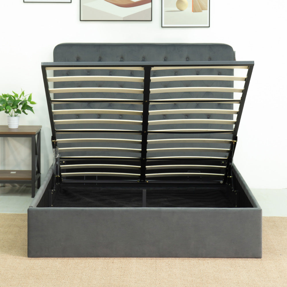 Beyond aesthetics, this bed frame is designed for modern living. The lift-up storage system offers a practical solution to keep your space organized, perfect for storing extra bedding or seasonal items. Built with durable wooden and steel slats, it provides sturdy support for a peaceful night's sleep.